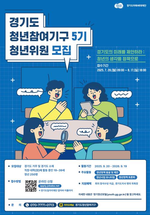 [뉴스노크=김인호 기자] 경기도와 경기도미래세대재단은 청년들이 직접 청년정책을 발굴하고 제안할 수 있는 ‘제5기 경기도 청년참여기구’ 위원을 오는 8월 17일까지 모집한다.