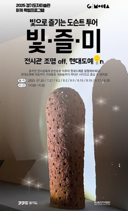 [뉴스노크=김인호 기자] 한국도자재단 경기도자미술관이 7월 26일부터 8월 30일까지 주말과 공휴일 등 9회에 걸쳐 경기도자미술관 2층 상설전시실에서 여름 특별 도슨트(전시 해설가) 프로그램 ‘빛으로 즐기는 미술관’을 운영한다.