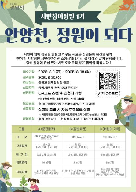 박승원 광명시장은 “이번 사업은 안양천을 시민의 손으로 가꾸며 도시와 자연이 조화를 이루는 ‘정원도시 광명’ 실현의 출발점”이라며 “시민이 직접 정원을 기획하고 가꾸는 경험으로 정원문화가 자연스럽게 확산되길 기대한다”고 밝혔다.