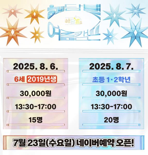이번 캠프는 ‘빛’과 ‘물’을 주제로 진행되며, 연 나이 6세(2019년생) 어린이와 초등 1~2학년 학생을 위한 맞춤형 프로그램으로 구성되어 있다.