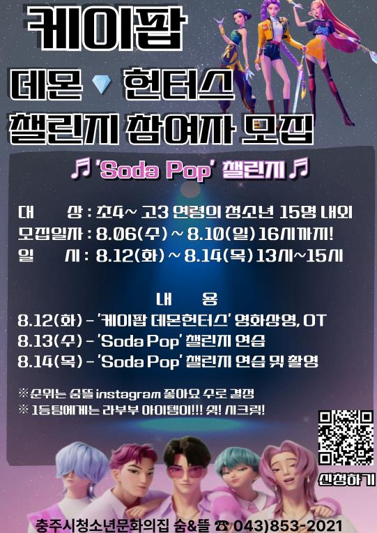 [뉴스노크=김인호 기자] 충주시 청소년문화의집 숨·뜰은 청소년들의 문화예술 활동을 장려하고자‘케이팝 데몬헌터스’ 영화 속 노래 ‘소다 팝(Soda Pop)’ 춤 챌린지 프로그램을 진행한다고 밝혔다.