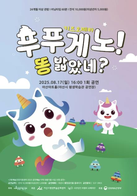[뉴스노크=김인호 기자] 아산시가 ‘2025 공연예술 유통 지원사업’에 선정된 작품 키즈오페라 ‘푸푸게노! 똥 밟았네?’를 8월 방학 시즌을 맞아 17일 아산아트홀에서 개최한다.