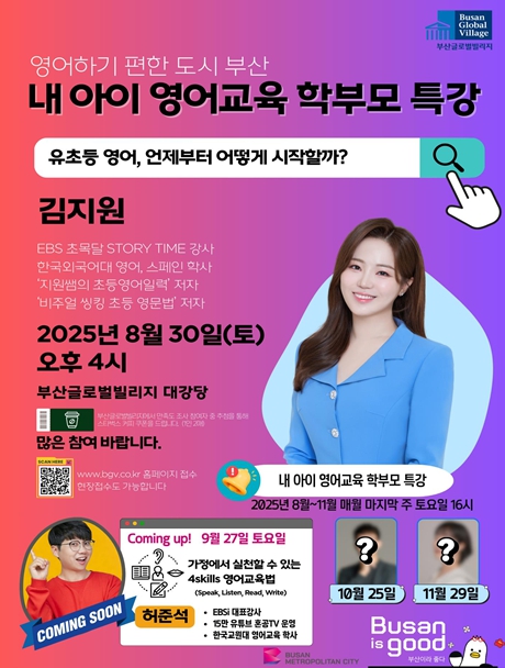 김귀옥 시 청년산학국장은 “아이들에게 영어를 가르치는 것은 우리 아이들이 자유롭게 세계와 소통할 수 있는 글로벌 허브 도시의 주인으로 성장시키는 과정이다”라며, “영어교육에 대한 학부모의 이해를 도와 부산 지역 아이들이 영어교육 걱정 없는 도시를 만들고자 이번 특강을 마련했으니 많은 관심과 참여 부탁드린다”라고 전했다.