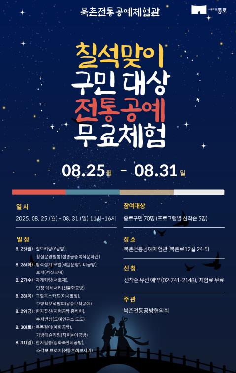 [뉴스노크=김인호 기자] 종로구가 2025년 음력 칠월칠석(8월 29일)을 맞아 북촌전통공예체험관(북촌로12길 24-5)에서 '칠석맞이 주민친화행사'를 개최한다.