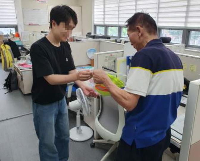 | ▲ 재활용가능자원 수집인 어르신에게 안전물품과 온열질환 예방 물품을 전달하고 있다. |