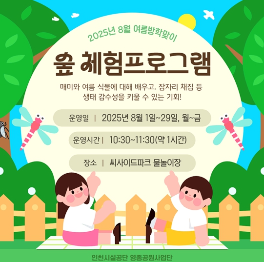 [뉴스노크=김인호 기자] 인천시설공단(이사장 김재보) 영종공원사업단은 씨사이드파크 물놀이장에서 ‘여름방학 맞이 특별 숲 체험 프로그램’을 내달 1일부터 29일까지 주말 및 공휴일 제외한 평일에 운영한다.