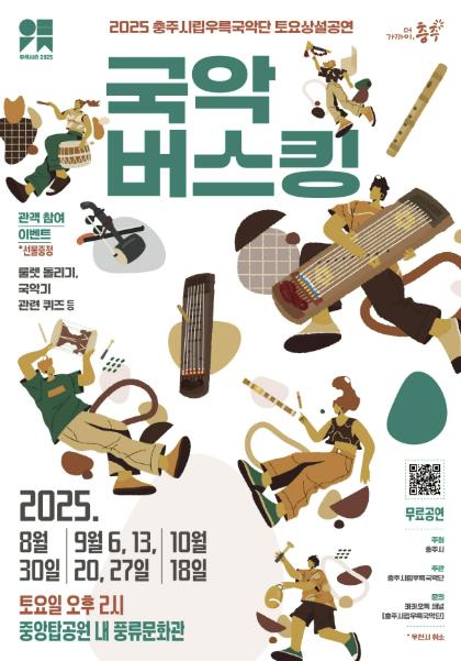 [뉴스노크=김인호 기자] 충주시립우륵국악단이 8월 30일부터 10월 18일까지 충주시 중앙탑공원 풍류문화관에서 하반기 토요상설공연 ‘국악버스킹’을 총 6회에 걸쳐 개최한다.