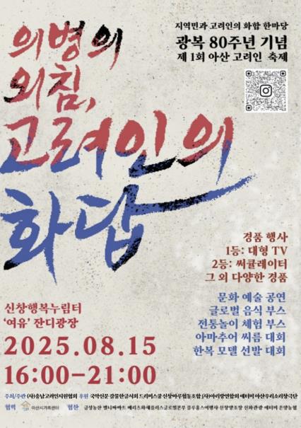 [뉴스노크=김인호 기자] 광복 80주년을 맞아 고려인과 지역민이 함께하는 ‘제1회 아산 고려인 축제’가 오는 8월 15일 아산시 신창면 커뮤니티센터에서 열린다.