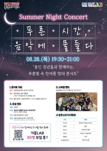 [뉴스노크=김인호 기자] 용인특례시는 청년을 위한 특별한 문화행사인 ‘한여름 밤의 콘서트’를 28일 오후 7시 30분 용인청년LAB 기흥에서 개최한다고 22일 밝혔다.