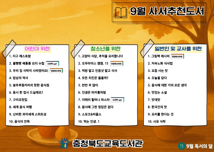 [뉴스노크=김인호 기자] 충청북도교육청 직속기관 교육도서관은 '읽고, 맛보고, 즐기자!(음식)'를 주제로 2025년 언제나 책봄 열두달 북큐레이션 9월 사서추천도서 30권을 선정했다고 밝혔다.
