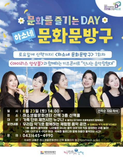 [뉴스노크=김인호 기자] 제천문화재단은 오는 23일 오후 2시, 하소생활문화센터 산책에서 '하소네 문화문방구' 7회차 프로그램으로 클래식 연주단체 아이리스 앙상블과 함께하는 키즈 콘서트 '신나는 음악 탐험대'를 개최한다고 밝혔다.