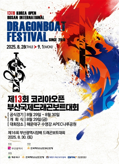 [뉴스노크=김인호 기자] 부산시는 오늘(28일)부터 9월 1일까지 5일간 수영강 에이펙(APEC) 나루공원 일원에서 '제13회 코리아오픈 부산국제드래곤보트대회 및 제16회 부산광역시장배 드래곤보트대회'를 개최한다고 밝혔다.