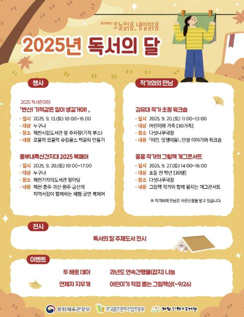 또한 △20일 오전 10시, 지역 서점‧작가 협력 프로젝트 ‘중부내륙산간지대 2025 북페어’ △연체자 지우개 △20권까지 대출 가능한 ‘두배로 데이’ 등 다양한 프로그램을 통해 일상 속 독서 생활화를 장려할 계획이다.