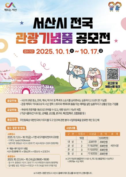 이완섭 서산시장은 “이번 공모전을 통해 서산의 스토리와 매력을 담은 관광기념품이 실제 상품으로 이어져 지역 경제에 활력을 더할 수 있기를 기대한다”라며 “특히, 관광 캐릭터 가티와 오슈를 이용하여 상품화와 판매가 가능한 제품으로 출품되기를 기대한다”라고 말했다.