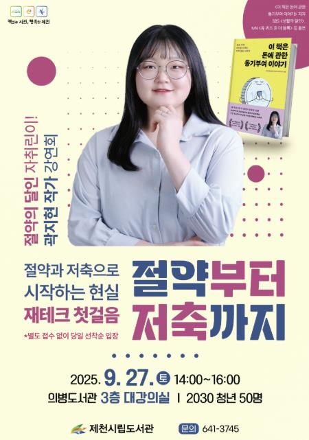 [뉴스노크=김인호 기자] 제천시립도서관은 오는 27일 오후 2시, 의병도서관 3층 대강의실에서 곽지현 작가 초청 강연 '절약부터 저축까지'를 개최한다.