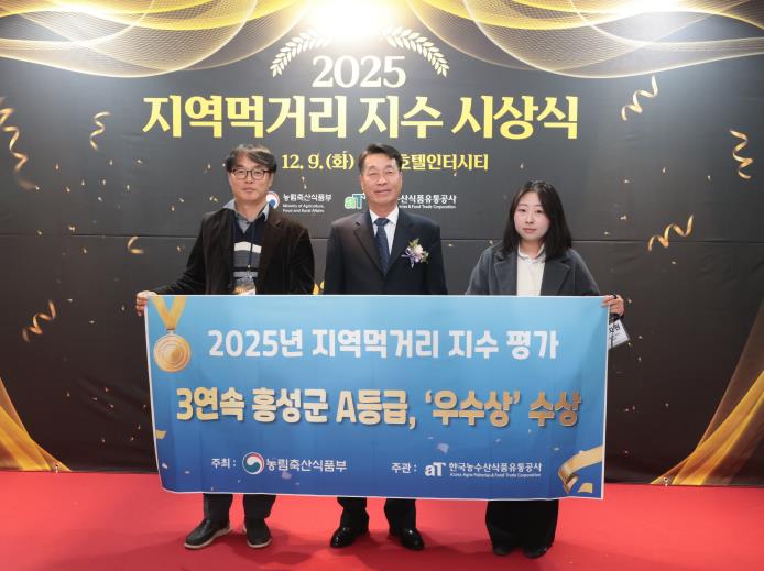 [뉴스노크=김인호 기자] 충남 홍성군은 지난 9일 농림축산식품부가 주최하고, 한국농수산식품유통공사에서 주관하는 ‘2025년 지역먹거리 지수 평가’에서 3년 연속 A등급을 달성, “우수상”(한국농수산식품유통공사 사장상)을 수상하며 지역먹거리 정책 우수 지자체로서의 위상을 굳건히 했다고 밝혔다.