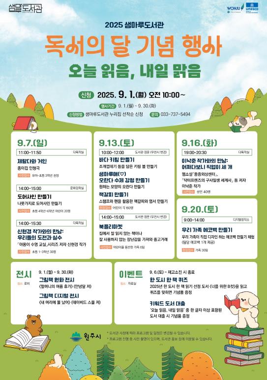 [뉴스노크=김인호 기자] 원주시 샘마루도서관은 9월 ‘독서의 달’을 기념해 작가 강연, 공연, 북플리마켓, 체험, 전시, 이벤트로 구성된 다양한 문화 행사를 개최한다.