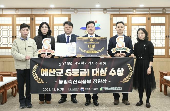 [뉴스노크=김인호 기자] 예산군은 농림축산식품부가 주최하고 한국농수산식품유통공사(aT)가 주관한 2025년 지역먹거리지수 평가에서 전년 대비 두 단계 상승한 최고 등급 S등급을 달성하고 대상을 수상하는 성과를 거뒀다고 밝혔다.