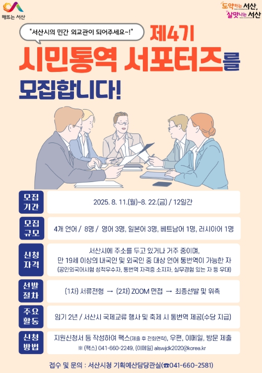 [뉴스노크=김인호 기자] 충남 서산시는 11일부터 22일까지 제4기 시민통역 서포터즈를 공개 모집한다고 밝혔다.