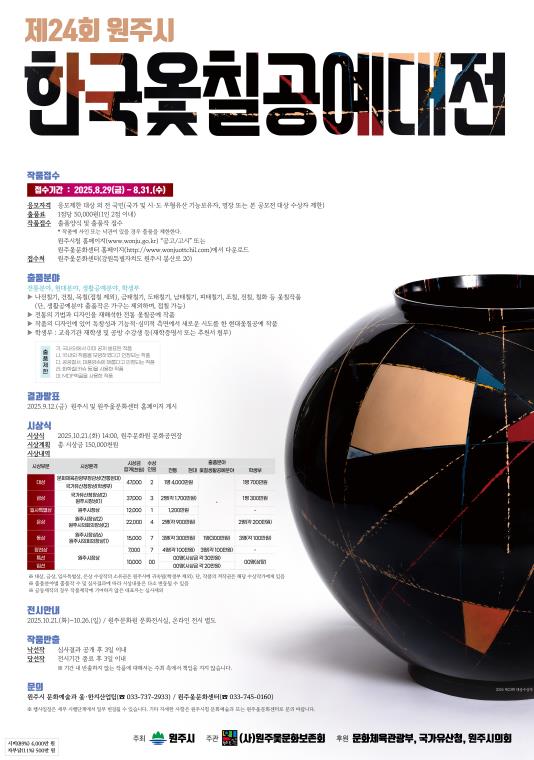 [뉴스노크=김인호 기자] 원주시는 오는 29일부터 31일까지 3일간 원주옻문화센터(봉산로 20)에서 제24회 원주시 한국옻칠공예대전 출품작을 접수한다.