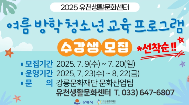 [뉴스노크=김인호 기자] (재)강릉문화재단은 여름방학을 맞아 관내 청소년들의 문화 향유 기회를 확대하기 위해 '2025 유천생활문화센터 여름방학 청소년 교육프로그램'수강생을 모집한다.