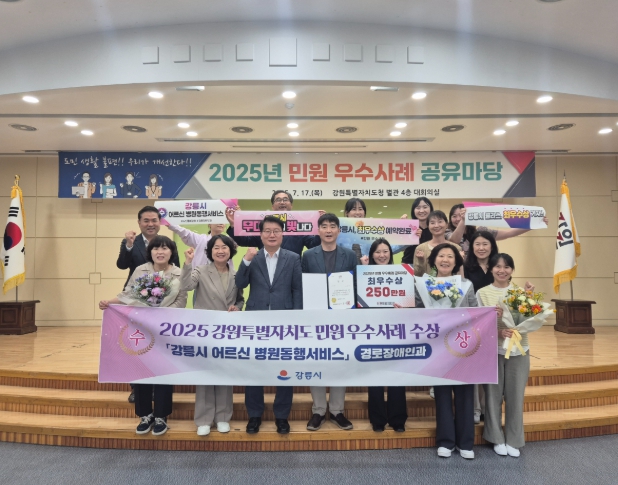 [뉴스노크=김인호 기자] 강릉시가 지난 17일 도청 별관 회의실에서 개최된 ‘2025년 강원특별자치도 민원 우수사례 공유마당’에서 '어르신 병원동행서비스' 시행으로 최우수상 수상의 영예를 안았다.