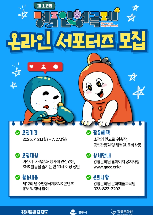 [뉴스노크=김인호 기자] 강릉문화원은 오는 7월 21일부터 7월 27일까지 제12회 명주인형극제 홍보 활동을 함께할 온라인, 오프라인 서포터즈를 모집한다.