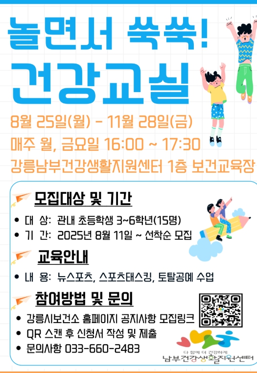 [뉴스노크=김인호 기자] 강릉시는 관내 초등학교 3~6학년을 대상으로 남부건강생활지원센터에서 진행되는 ‘놀면서 쑥쑥! 건강교실’ 참여 희망자 15명을 11일부터 선착순으로 모집한다.