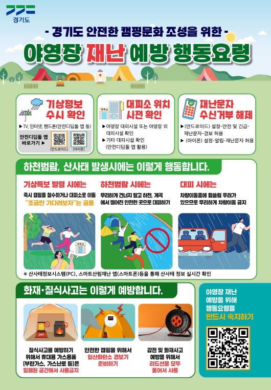 [뉴스노크=김인호 기자] 경기도는 예측이 어려운 기상상황에 대비해 야영장 이용객의 신속한 대피를 돕기 위한 행동요령 홍보물 10만 8천 부를 제작해 야영장 등에 배포했다고 22일 밝혔다.