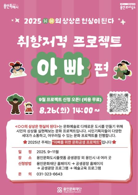 [뉴스노크=김인호 기자] 용인문화재단은 오는 9월부터 시민기획 프로젝트 〈○○의 상상은 현실이 된다 – 취향저격 프로젝트 : 아빠편〉을 통해 다양한 문화예술 교육·체험 프로그램을 선보인다.