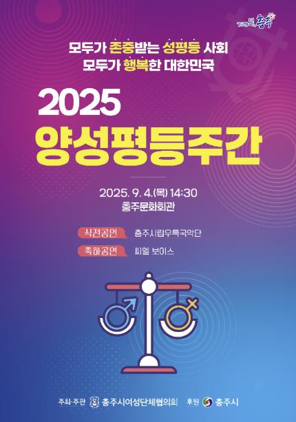 양성평등문화제 미술·공예 공모전 입상 작품 전시회는 9월 2일부터 4일까지 충주시 문화회관 전시실에서 개최되며, 양성평등주간 기념식은 9월 4일 오후 2시 30분 충주시 문화회관 대강당에서 개최된다.