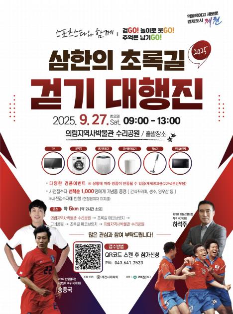 [뉴스노크=김인호 기자] 제천시체육회는 오는 9월 27일 오전 9시부터 오후 1시까지, 의림지 역사박물관 수리공원 일원에서'2025 삼한의 초록길 걷기 대행진'을 개최한다고 밝혔다.