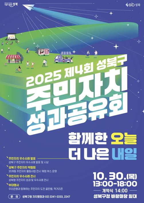 [뉴스노크=김인호 기자] 서울 성북구가 오는 10월 30일 지역 주민들과 함께 1년간의 주민자치 활동 성과를 공유하고 주민화합을 도모하는 '2025 제4회 성북구 주민자치성과공유회'를 개최한다고 밝혔다.