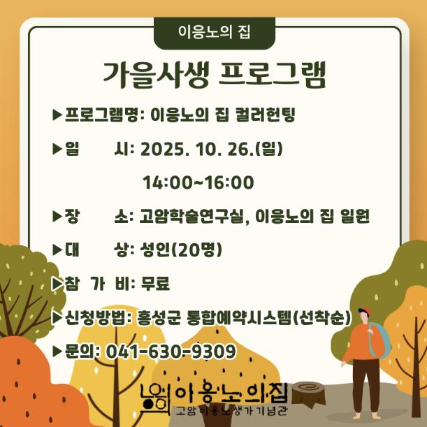 이번 프로그램은 가을 정취가 무르익은 이응노의 집 주변 풍경을 배경으로, 참가자들이 직접 자신만의 시선으로 자연의 색감을 담아내는 야외 사생 체험으로 구성됐다. 고암 이응노 화백의 예술 정신을 되새기며, 자연 속에서 창의성과 감성을 발휘할 수 있는 시간이 될 것으로 기대된다.