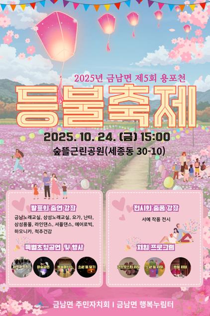 [뉴스노크=김인호 기자] 세종특별자치시 금남면 주민자치회가 24일 숲뜰근린공원 코스모스 꽃밭(세종동 30-10) 일원에서 ‘제5회 용포천 등불축제’를 개최한다.