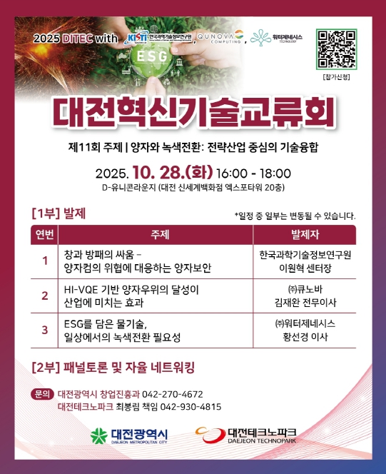 최원혁 대전시 기업지원국장은 “2025년 노벨물리학상이 양자컴퓨터 기술 발전에 공헌한 연구진에게 돌아가는 등 전 세계적으로 양자 기술의 잠재력과 중요성이 인정받고 있다”라며 “양자 산업 분야는 아직 초기 단계로 아마존, 구글, MS 등 글로벌 대기업뿐만 아니라 스타트업에도 새로운 기회가 열려있다”라며 “양자 기술 분야에 관심 있는 분이 이번 교류회에 참석해 양자 분야 산업 동향에 대한 정보를 얻어가시길 바란다”라고 말했다.