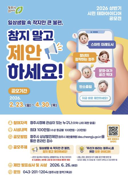 [뉴스노크=김인호 기자] 청주시는 시민의 창의적인 아이디어를 시정에 반영하기 위해 2월 23일부터 4월 30일까지 ‘2026년 상반기 시민 테마아이디어 공모전’을 개최한다.