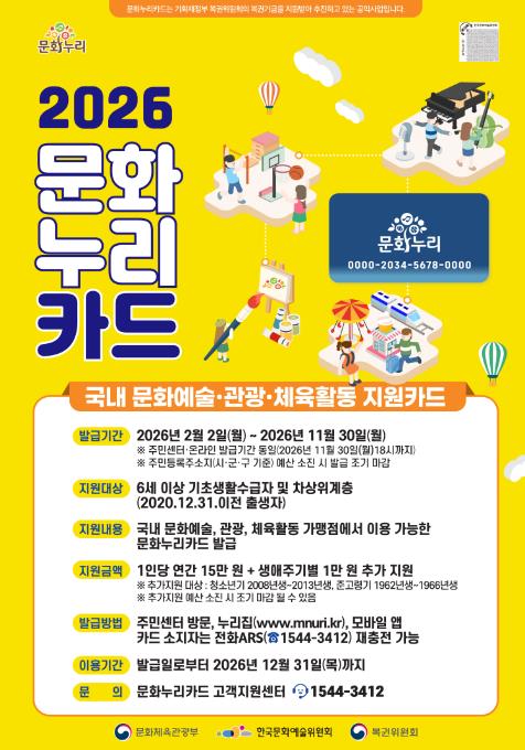 [뉴스노크=김인호 기자] 세종특별자치시가 내달 2일부터 소외계층의 문화 격차 해소를 위한 2026년도 문화누리카드 발급을 시작한다.
