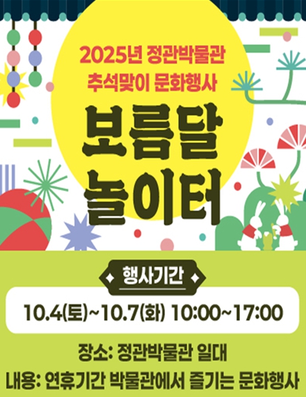 [뉴스노크=김인호 기자] 정관박물관은 다가오는 추석을 맞아 특별 문화행사 '보름달 놀이터'를 오는 10월 4일부터 10월 7일까지 개최한다고 밝혔다.