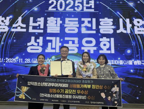 [뉴스노크=김인호 기자] (재)당진시청소년재단 소속 합덕청소년방과후아카데미와 송악청소년방과후아카데미가 2025년 11월 28일 방과후아카데미 사업 종합평가에서 최고 영예인‘최우수기관’으로 선정되는 쾌거를 이루었다. 이와 더불어 성평등가족부 장관상과 특별상(한국청소년활동진흥원이사장)을 수상하며 그간의 노력을 인정받았다.