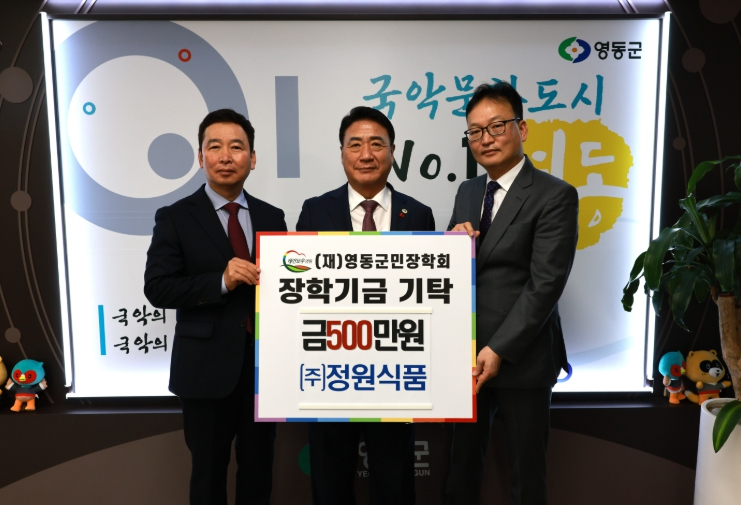 [뉴스노크=김인호 기자] ㈜정원식품(대표 김훈섭)은 16일 오후 영동군청을 방문해 지역 미래 인재를 육성하기 위한 장학금 500만 원을 (재)영동군민장학회에 기탁했다.