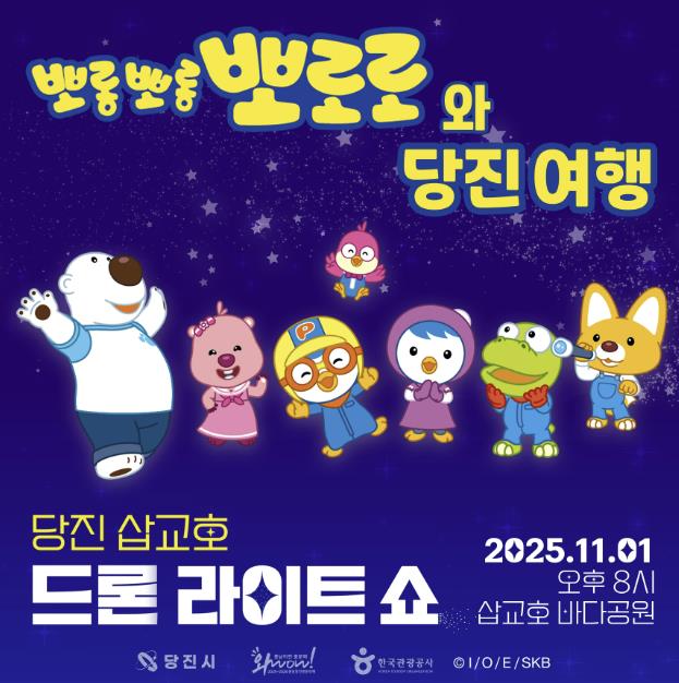 [뉴스노크=김인호 기자] 당진시는 오는 11월 1일 삽교호관광지 바다공원 일원에서 ‘뽀롱뽀롱 뽀로로와 당진 여행’을 주제로 2025 당진 삽교호 드론 라이트 쇼의 화려한 폐막 공연을 개최한다고 27일 밝혔다.