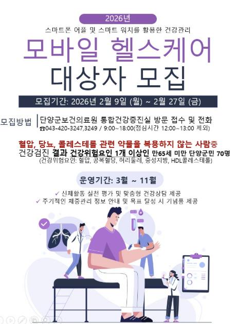 [뉴스노크=김인호 기자] 단양군은 군민의 만성질환 예방과 건강생활 실천을 지원하기 위해 ‘2026년 모바일 헬스케어 사업’ 대상자를 오는 27일까지 모집한다.