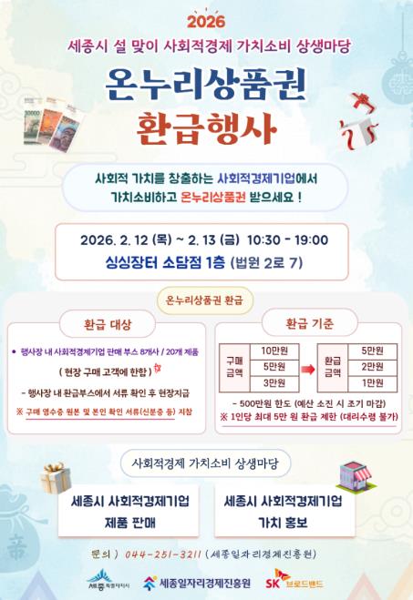 [뉴스노크=김인호 기자] 세종일자리경제진흥원이 설 명절 소비 대목을 맞아 오는 2월 12일부터 13일까지 양일간 싱싱장터 소담점(1층)에서 ‘2026년 설 맞이 사회적경제 가치소비 상생마당’을 운영한다.