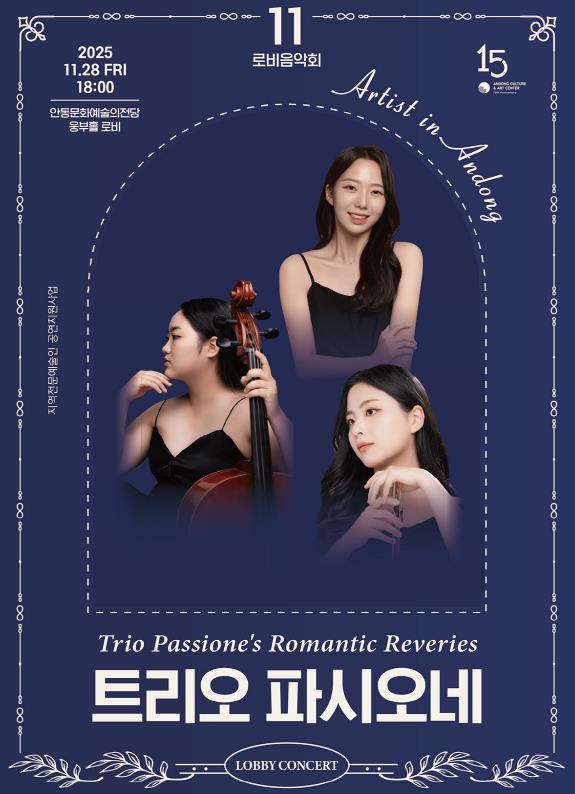 [뉴스노크=김인호 기자] 안동문화예술의전당은 지역 문화예술 활성화와 전문 예술인의 역량 강화를 위해, 지역전문예술인 공연지원사업의 일환으로 로비음악회를 진행하고 있다. 오는 11월 28일 오후 6시, 웅부홀 로비에서 클래식 앙상블 Trio Passione(트리오 파시오네)의 공연이 열린다.