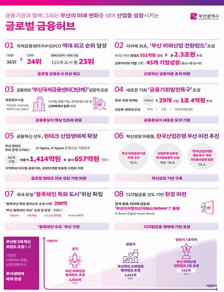 아울러, 부산디지털자산거래소 설립 지원 등으로 자본과 인재, 기술이 선순환하는 글로벌 허브도시를 만들고자 한 노력이 국제금융센터지수 역대 최고인 24위를 기록하는 등 의미 있는 성과를 나타내고 있다.
