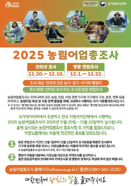 조사 대상은 관내 모든 농가, 임가, 어가(해수면, 내수면)와 행정리를 대상으로 실시되며, 국가데이터처에서 11월 중순에 발송한 안내문을 받은 11,350여 가구를 조사한다. 조사내용은 성명, 국적, 경영형태, 판매 금액 등을 포함한 총 4개 분야 133개 항목으로 구성되고, 조사는 가구조사와 지역조사로 구분해 진행되며, 지역조사는 행정리장이 응답한다.