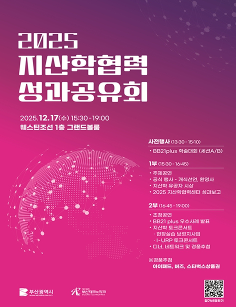 [뉴스노크=김인호 기자] 부산시는 오늘(17일) 오후 3시 30분 웨스틴조선호텔에서 '2025 지산학협력 성과공유회'를 개최한다고 밝혔다.