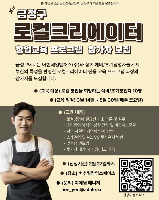 본 프로그램은 금정구 '지역상권 활력지원 사업'으로, 지역의 자연·문화·역사적 특성과 창의적인 아이디어를 결합해 새로운 사업적 가치를 창출할 로컬크리에이터를 발굴하고 경쟁력 있는 기업으로 성장할 수 있도록 지원하기 위해 마련했다.