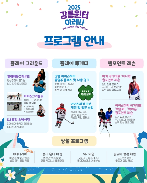 최용규 체육과장은 “한여름에 즐기는 겨울 스포츠의 색다른 재미를 느낄 수 있는 기회”라며, “2025 강릉윈터아레나를 통해 빙상스포츠가 더욱 친근하게 시민 곁에 다가가기를 바란다.”고 말했다.